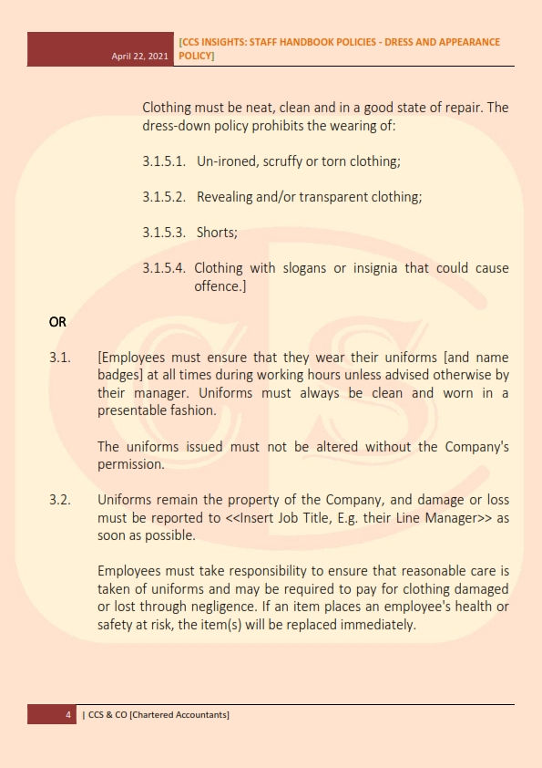 While an employer wants to establish criteria for acceptable standards of dress and personal appearance in the workplace, when employees are working remotely, and when employees are travelling on company business, this Dress and Appearance Policy can be used to do so.