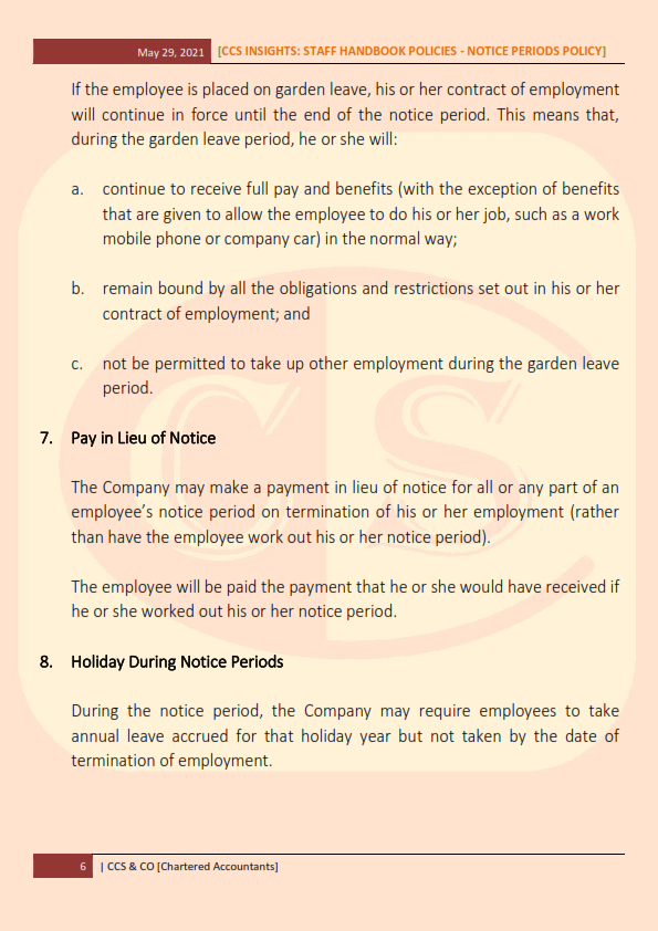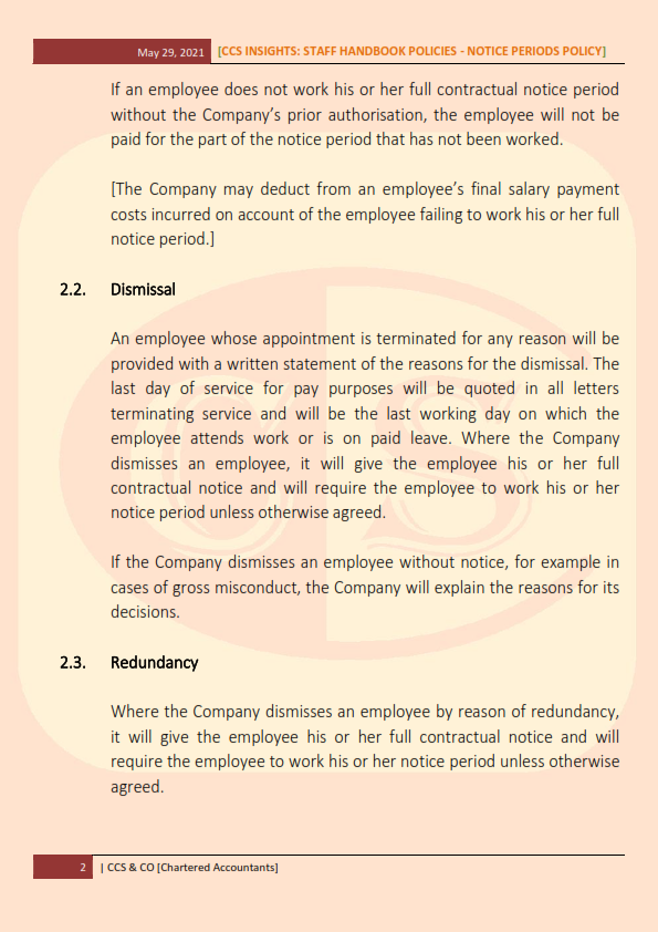This Notice Periods Policy sets down the circumstances in which an employee will be required to work their notice period and the employer’s expectations of the employee during the notice period in the event of the different scenarios of resignation, dismissal, redundancy and retirement.