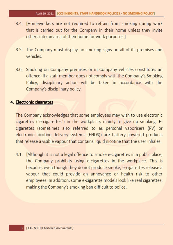 The No Smoking Policy also includes workers who perform their duties from home and use electronic cigarettes (e-cigarettes) in their employment.