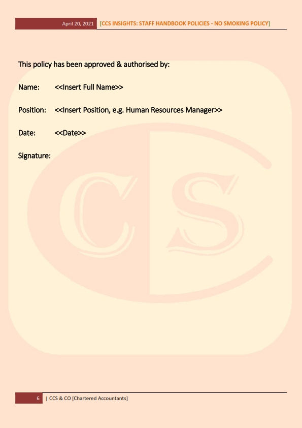 This No Smoking Policy outlines the obligations that a Company has to offer its employees a risk-free environment to work in and enforce the ban on smoking in public places.