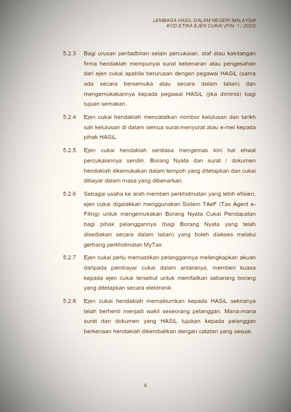 Following the implementation of MS ISO 37001:2016 Anti-Bribery Management System (ABMS) certification at the Inland Revenue Board of Malaysia (LHDNM), LHDNM has updated the Tax Agent Ethics Code (PIN. 1/2023).